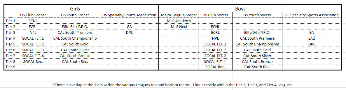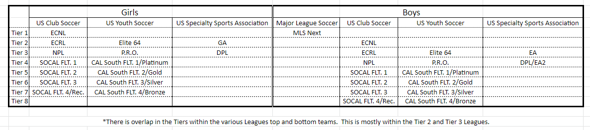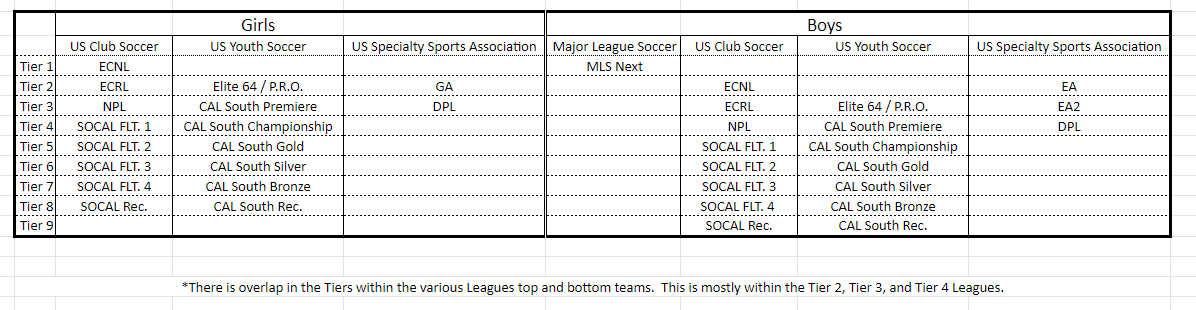 Thanks for the updated info on CalSouth, I made this last year and haven't really followed their branding changes. There are always going to be one or two exceptions for specific teams and the overlap, as the annotation states, Tier 2, 3, and 4 leagues have a lot of overlap. Some great teams are locked out of leagues, and can perform very well at higher levels. Some teams like to sandbag in lower level leagues, and can perform well against teams in higher leagues. Some teams are in a league because the club must enter a team for that age group, and they are not playing up to par. The chart is based of the mean average level of play of the teams in that league. There is also a problem of Hierarchy within the overseeing organization when comparing leagues. For example, USYS products are designed with the hierarchy of E64, PRO, and then USYS Regional Leagues (Cal South). If Cal South Premiere is moved up to be in line with low level EA or high level EA2, then it would imply E64 is performing with MLS Next, which it is not. Southwest does not really have a PRO following, and the E64 is in reality, not much better than the regional leagues top flights (Cal South/SOCAL), but I can't really justify moving Cal South Premiere above E64 because a few teams are performing at the bottom of EA level. I did decide to combine the E64 and P.R.O., because the southwest just doesn't really participate in P.R.O.. Here is a slightly updated chart for all of us to debate.