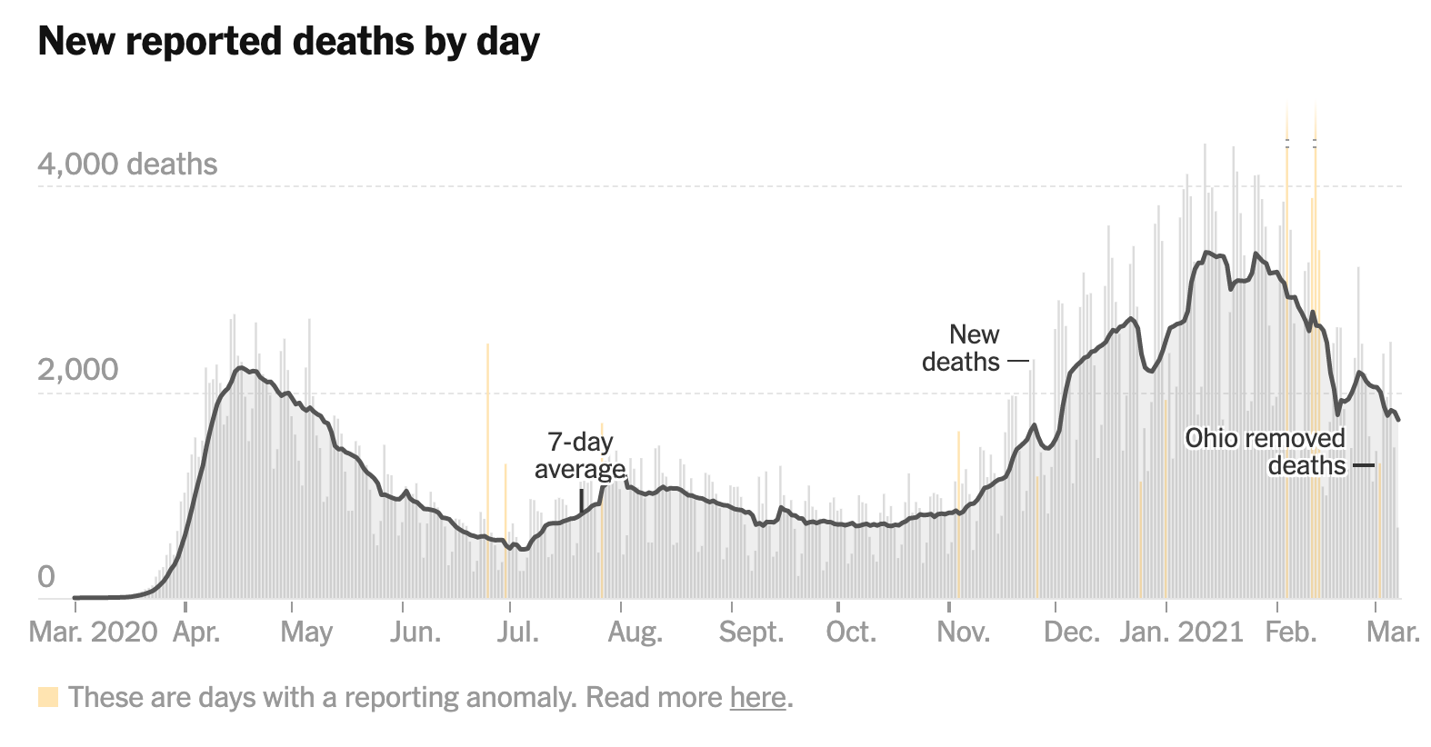 If you are measuring what will happen with variants, you need to ask how long it will take something like Eeek or P.1 to grow to 100k cases per day. If we have around 10 cases per day now, then we have about 13 doublings before it happens. 16 doubling. In yos if we are currently at 1-2 cases per day. Half year? Maybe hits late fall, once the summer stops helping us? I haven’t seen anything on how fast the smaller variants are growing, so this doesn’t even count as a SWAG.