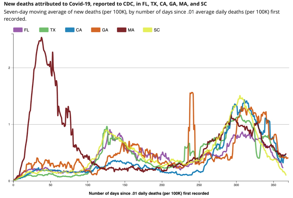 "What can we conclude from such a visualization? It suggests that the lockdowns have had no statistically observable effect on the virus trajectory and resulting severe outcomes. The open states have generally performed better, perhaps not because they are open but simply for reasons of demographics and seasonality.