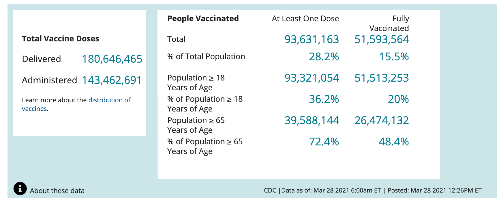 NYTimes Vaccine tracker has changed and appears to exclude certain states now. CDC has a nice summary I found that I actually prefer for an overall perspective. Looks like we'll be at over 30% with at least one dose by the end of March. The US is averaging over 3 million shots/day over the last 5 days. J&J is getting into the mix more now as well. It's good to see over 72% of the population over 65 is vaccinated already.