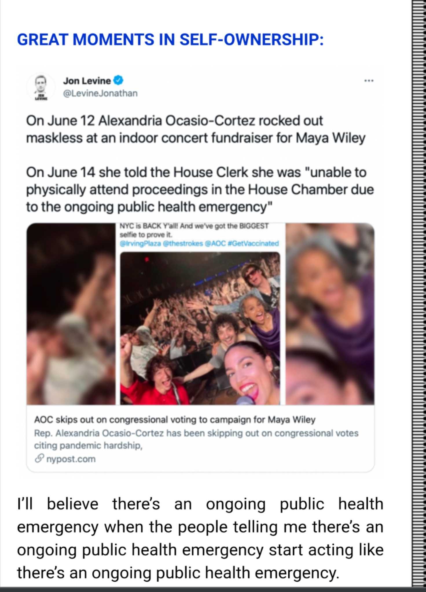 I am in Whole Foods this weekend. I estimate 80-90% of the people are wearing masks. In SC County, the % of 12 year-old plus who aren't fully vaccinated is under 19% and likely considerably less where I am. I didn't wear my mask and didn't notice anyone disapproving. This morning I am riding my bike out on a wide gravel service road trail. I see 7 "sets" of 1 or 2 people walking over a 15-minute interval of riding. 4 sets had masks on, and another that had a person that put on a mask as I approached. Then it hit me. Occam's razor. It's fear. That's all it is, fear. It's what drove many to willingly sacrifice their/our children's well-being when science didn't support the actions taken. Science was fine when it supported their fears, but not so much now.If wearing masks in public is "virtue signaling" (as suggested by an earlier poster), that is action without talking.