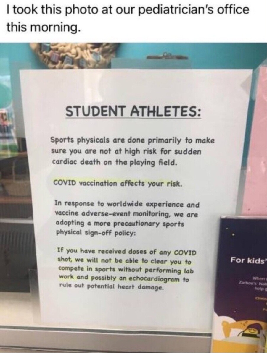 You missed the message. If your kid(s) plays pro sports or high level sports that work the heart muscles hard and got the clot shots, then get their heart and blood checked. I knew you would pounce on the note that was ment to get a response. You fell for it like the killer you are. Dumb dumb on here you are.Which pediatrician's office?