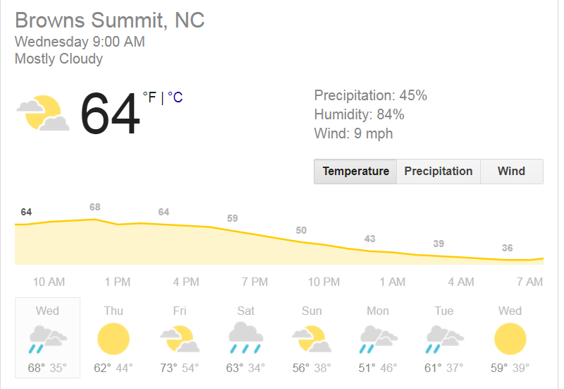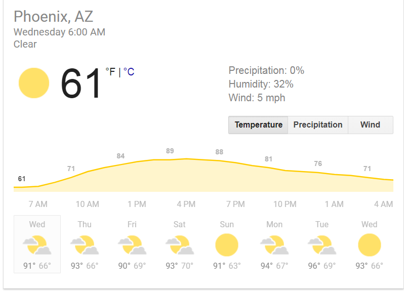 So upon checking the forecasts this weekend, it will be sunny and 90 in Phoenix. However, it's an 100% chance of rain in North Carolina with possible snow. I see the temp is forecast low 30s.