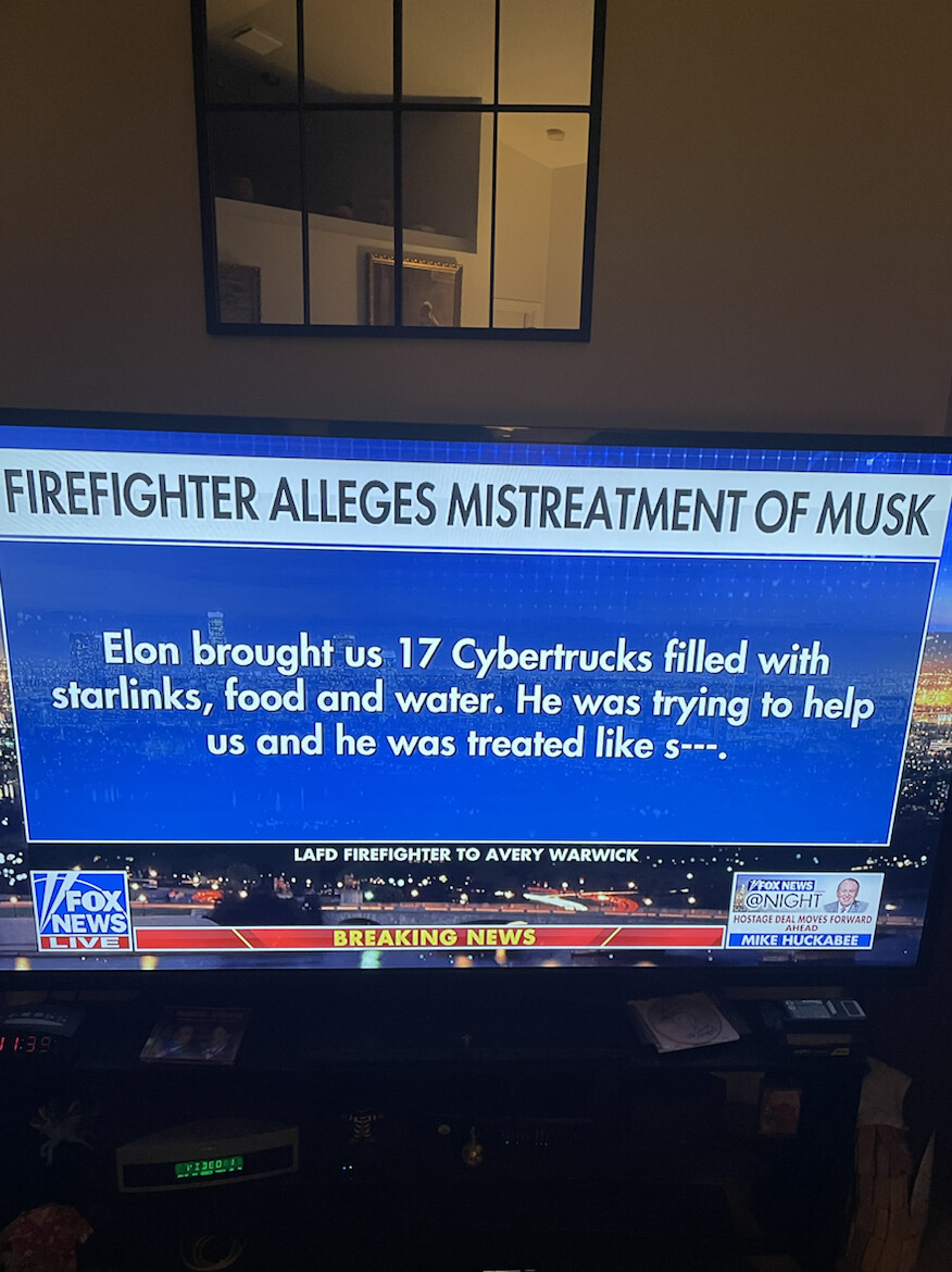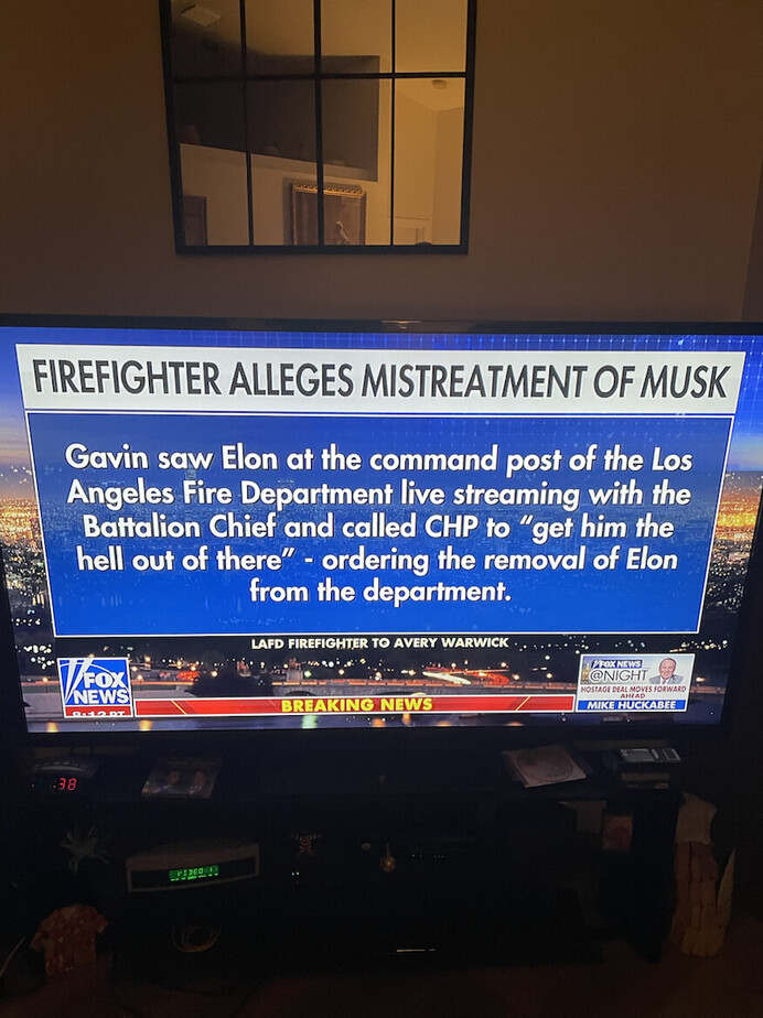 100% TRUE. Newsom called CHP and told them to toss him out from the ICP at the Palisades Fire. How this hasn't gotten any traction in the news is beyond me. He took Cybertrucks to Altadena Station / LASD so they'd have trucks to use as charging stations for whatever they needed. He also brought portable chargers for the trucks themselves. Cal Fire was told they'd better not be using the Starlinks on any of their rigs. LACo BoS were also marching to the same beat as Newsom and wanted no help from Musk. I'm betting if he'd never left CA and wasn't apart of the
