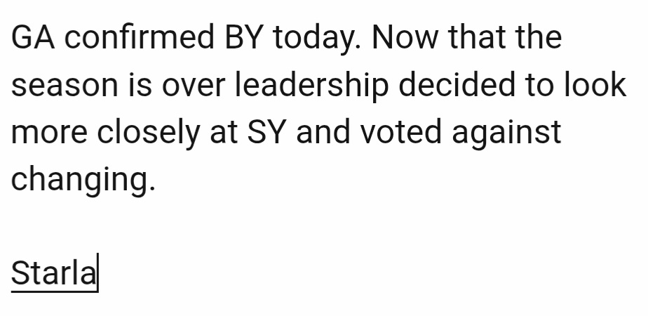My post signed by Starla was 100% made up. Just like the other cropped screenshot from a vague GA person.Both can't be correct. One of them has wrong information. (though both sources sure seem like they believe they have the truth).