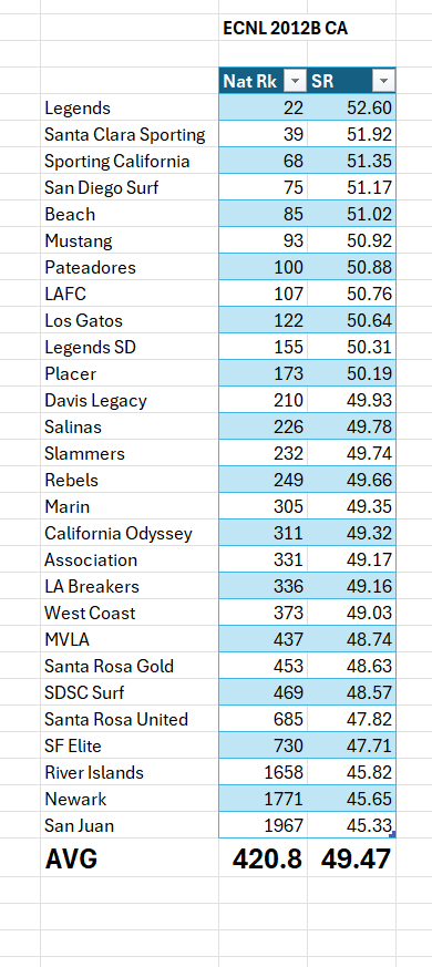 You might be right - they are closer in the youngers. Here's what 2012B looks like in CA, first MLS HD, then ECNL. Finally - here's what MLS HD looks like without the Academies. MLS HD is significantly different at the moment, and even if the Academies are removed it's still above ECNL by half a goal. But if you look between age groups (like 2012 to 2011 for ECNL, or between 2012 to 2013 for MLS), pegging that as a difference of ~2 goals, means that a shift of 5 months would imply a shift half goal to a goal. From there, it does look like next year they could be pretty similar on average. I do not think this means that ECNL tryouts are suddenly much more competitive than the MLS HD (non academy) ones - it looks instead like they'd be on par. But we'll all be able to see how it actually works out in practice soon enough.