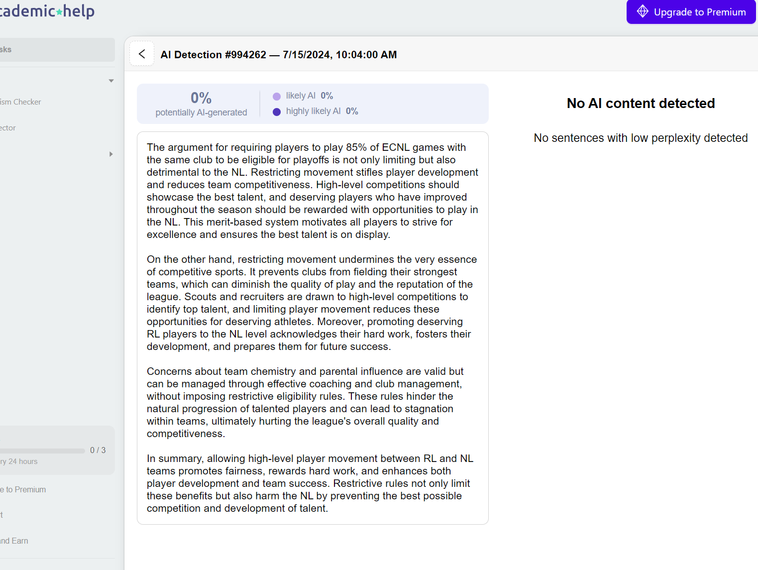 No AI here for me sir just using the new word smart spell & grammar check. First off, I’m no ECNL advocate, but here’s how I see it. I agree with you, driving through LA traffic after a full day of school is definitely not ideal for development. But it can definitely define astute focus and determination. Kids that have that discipline and focus are special. And yes, holding clubs and coaches accountable is crucial. But isn't there also value in allowing kids some flexibility to find the best fit for their growth? Stacking teams may not be perfect, but sometimes, a change of environment can spark new levels of performance, making it all more exciting. The rules are the rules, and every club can tactically take advantage of them equally as they all have the same opportunities.What are you talking about? Stop replying with AI and use your brain.
