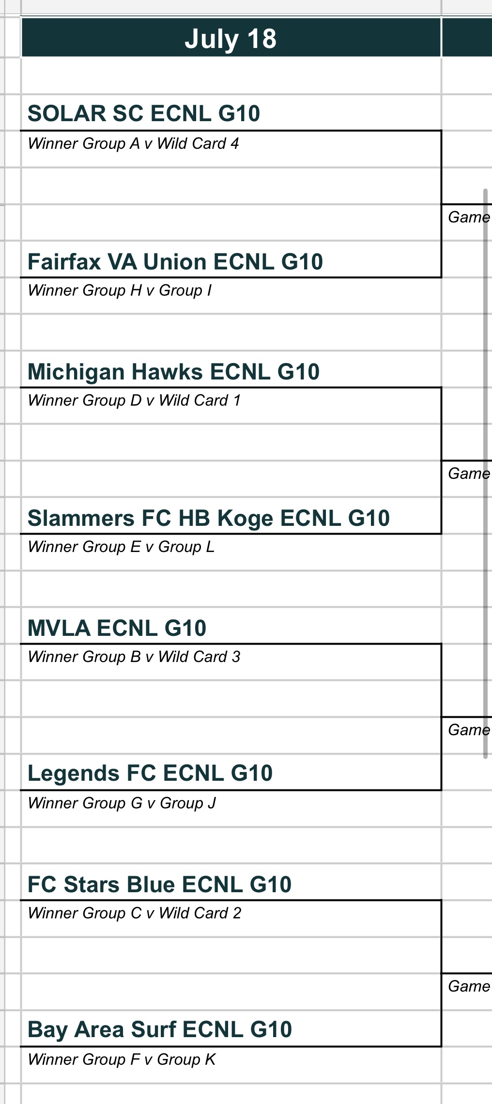 Everyone knows how Surf plays. Possession is one thing but their patterns of play are downright predictable. Surf has never had an athletically dominant group but they have top players playing attractive posession soccer. I would had predictable posession soccer to the previous sentence. Tape is out there, need to be more flexible especially with athletic teams that just punish your mistakes. It’s not u13 anymore. No excuses as they continue to poach from other rosters nationally. Congrats Hawks! Look out for Stars on the bottom half of the bracket to make it to Final 4 and make it awkward for the CA team that makes that game. Solar vs Koge in semi-finals is the final this year. Please Solar end this Koge assault on