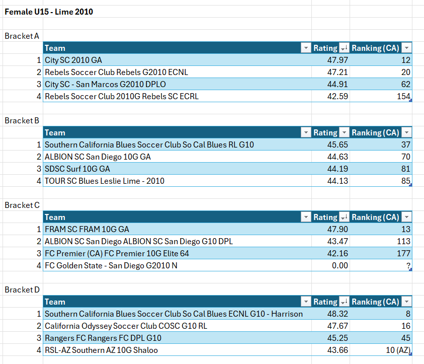 They could/should have made 3-4 flights out of this. I guess they didn't want to spend a few more $$ on trophies.I don't think it's that out of line for the most part. In Lime, there is a strong team in each bracket, then a 2nd such team, then the rest are filled in. It's likely going to be City GA or So Cal Blues Harrison taking the final. In Blue, it's pretty similar with a strong team in each bracket, then the rest. The one outlier is that they put So Cal Blues ECNL 2011G in this lower bracket, and even though it is one year younger, it's currently the #1 team in state, and the highest rated team in the entire tournament. I know there is plenty of drama shared publicly here about Blues, but it is still weird for them to put what has been up until this point the #1 team in state in a theoretically lower bracket.