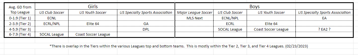 I'm just guessing at what Mark's doing to pull this together, but I hope that he is not just pointing exclusively to the primary data source of the league to rank the strength of the teams in the league, and only applying those game results to the teams in question. Instead, I'm hoping he's looking the strength/ratings of the teams in the particular league, inclusive of all the recorded matches that are assigned to that team. In some cases - there is no difference (like MLS Next, where teams pretty much exclusively play MLS Next). But for almost every other league, teams have game data from their primary league(s) plus all of the tournaments they play throughout the year. That game data, and those ratings, should be what's going in to the team ratings, and therefore these calculated league strength ratings.