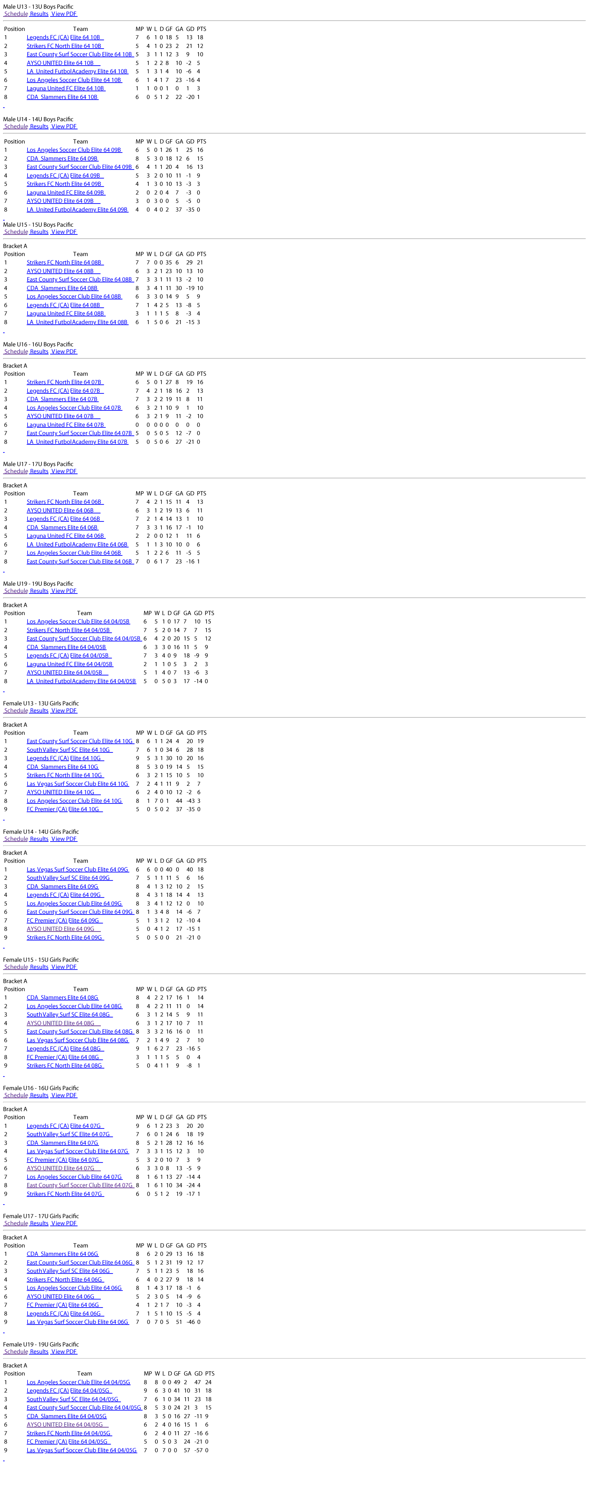 Club Average Position in E64 Standings 1South Valley Surf 2.5 2CDA Slammers Elite 3.5 3Legends FC 3.8 4Los Angeles Soccer Club 4.3 5East County Surf 4.4 6Strikers FC North 4.6 7AYSO United 5.3 8Las Vegas Surf 5.8 9Laguna United FC 6.2 10LA United Futbol Academy 7.2 11FC Premier 7.3