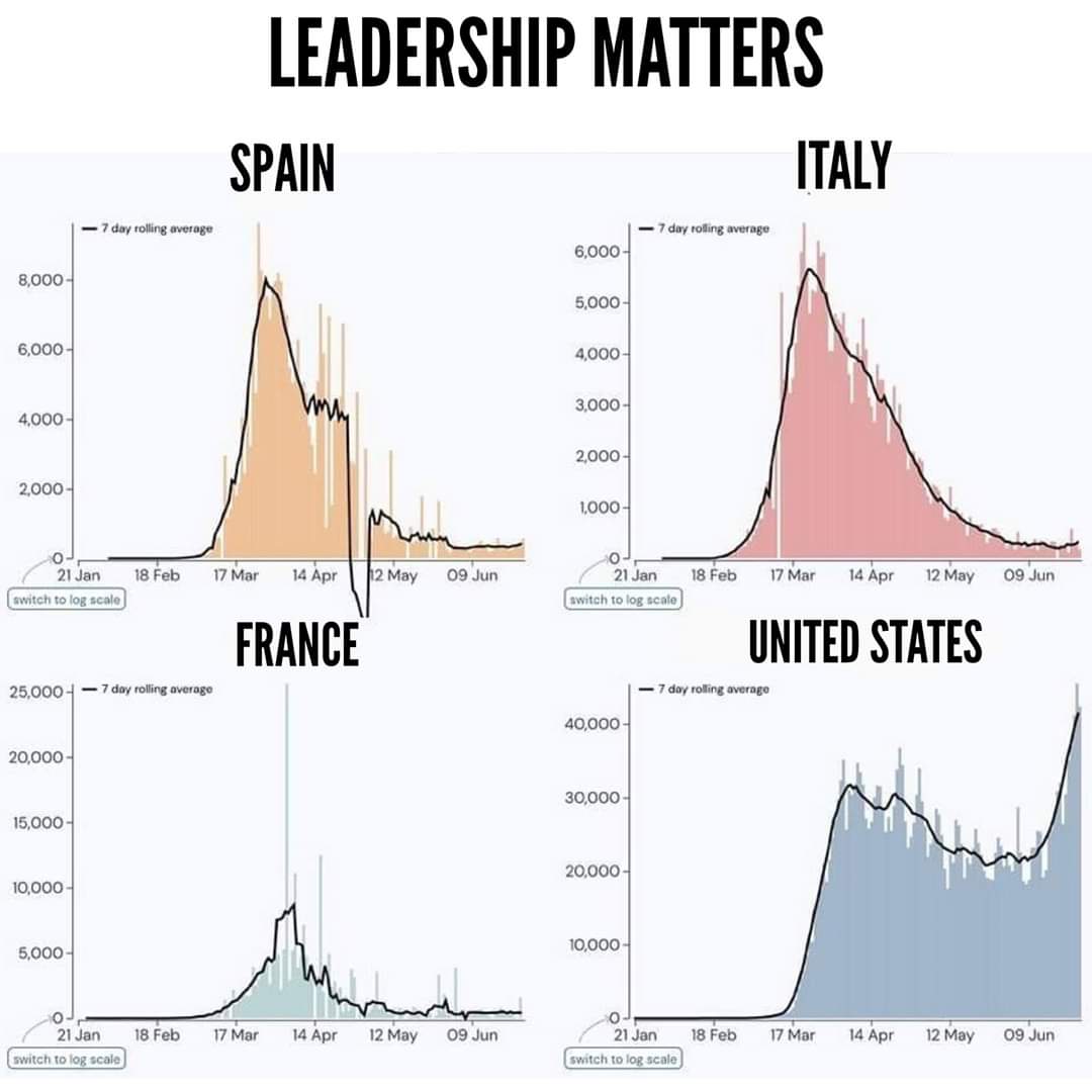 https://www.worldometers.info/coronavirus/ Death per 1million population USA 67.1 Italy 576 France 458 Spain 607.....were there other countries that you were thinking of? because this makes your post look really really badLeadership matters and this is where the USA needs to be better. While the rest of the world is showing progress where going in the opposite direction. This is sad to me and it's time for change. This is old but our numbers just continue to rise.
