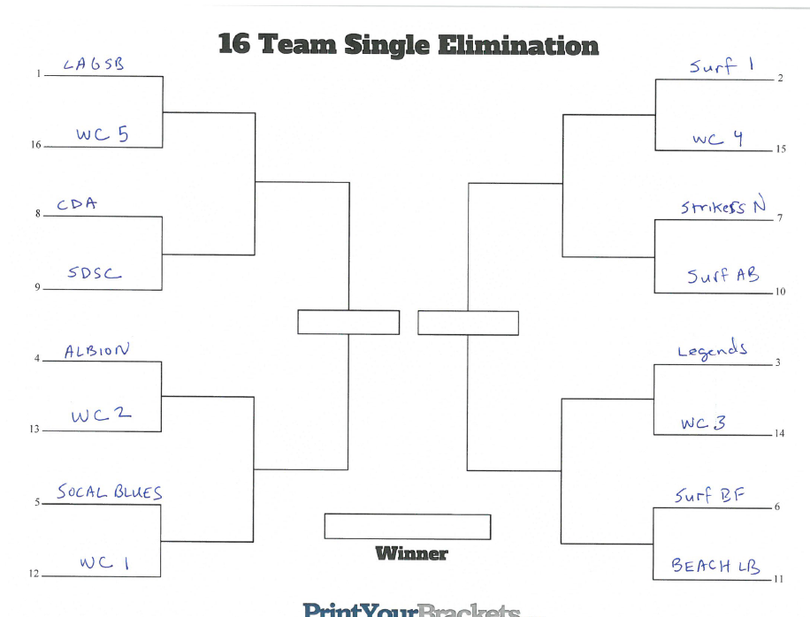 One interesting thing I just saw on the schedule is that groups J and K (the two groups of 3 instead of 4) actually play the three teams from the opposite group instead of just playing two games within their group. What if SD Surf A wins their first two games (including beating Anaheim) and is in position to win their group regardless of whether they win their 3rd game (which is against SD Surf B). Could they sandbag that last game in order to allow their sister team to win the group? Not saying they would, but it seems like a schedule like this makes it possible and I love a good conspiracy theory.