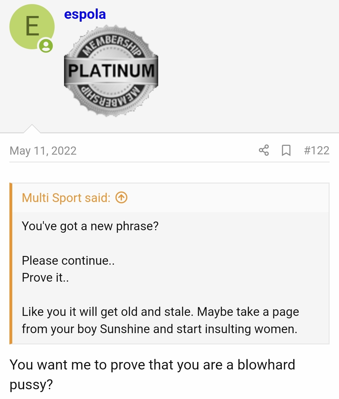 Like you posted.. that keyboard makes people brave.Let's look into the exchange a little deeper. After your repeated exhibitions of illogical enthusiasm for cryoto-currency investments, I asked if you were actually investing in them or were you just a blowhard pussy. Your response included "Prove it". I asked if you wanted me to prove you are a blowhard pussy.
