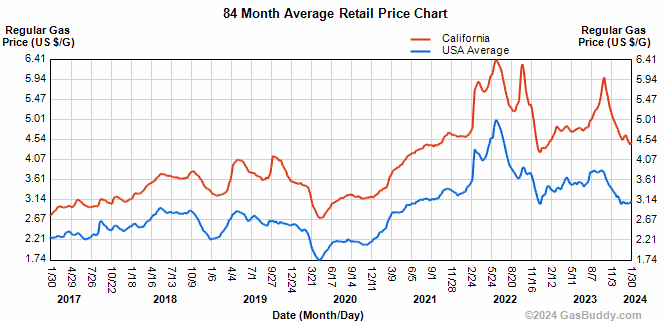 Keep in mind that the chart does not show external events, such as the drop in demand (and thus price at the pump) during the pandemic shutdown, and the irrational pricing during the initial phases of of the Russian invasion of Ukraine. The California numbers also show "local" events mostly attributable to temporary refinery outages and the semi-annual shifts between summer and winter fuel blends.