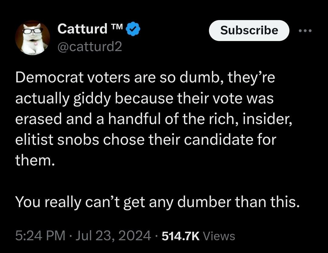 I'm telling you it's about 50/50 of my lib pals (I have a lot of them) who have switched and are now going to vote for the asshole Trump and the other half are undecided. Harris will get 33% of the dumb base but that's because of being brainwashed like espola and Husker Du. Two dumb dumbs of low quality.Well, they are the party that makes you feel better about your shortcomings.