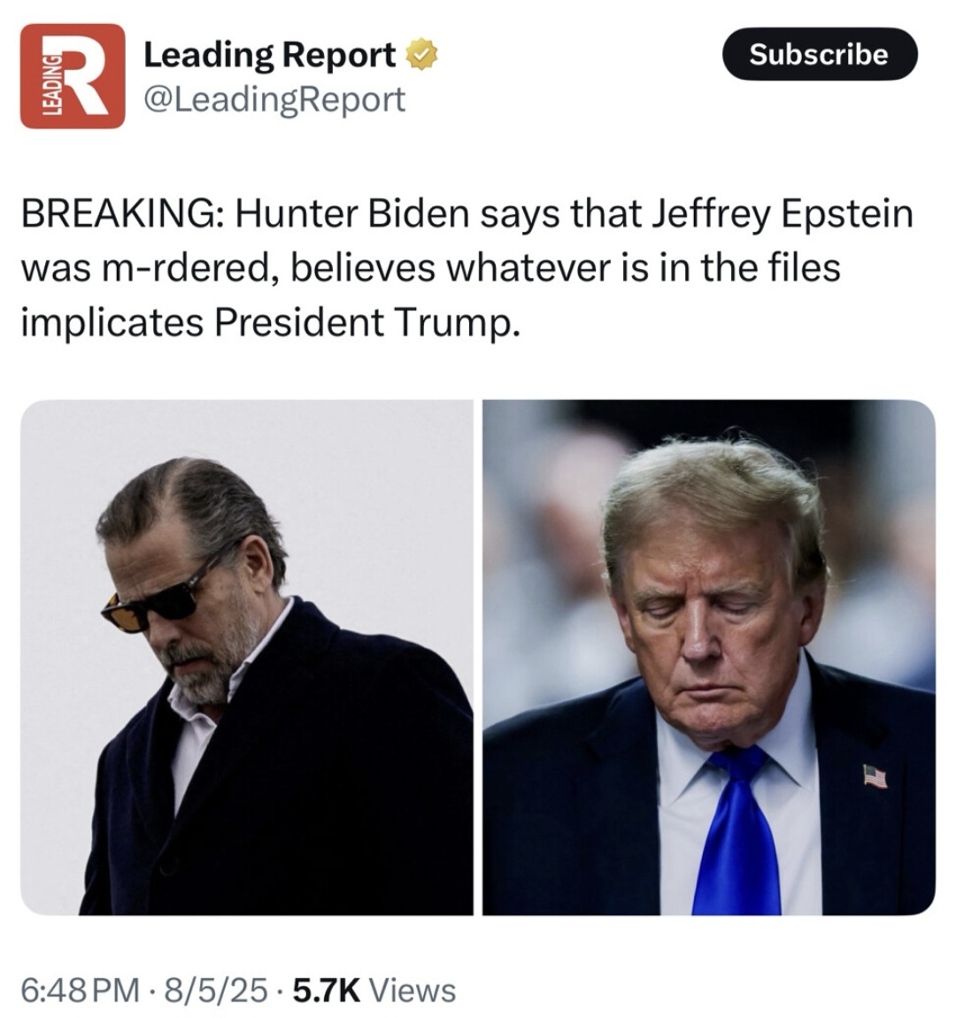 Hunter Biden's top 5 beliefs:Wonder Boy Hunter has spoken regarding Epstein Files. Remember everyone, everything they say is shit full of lies so I would take Hunters insights with a grain of crack and your favorite shot.