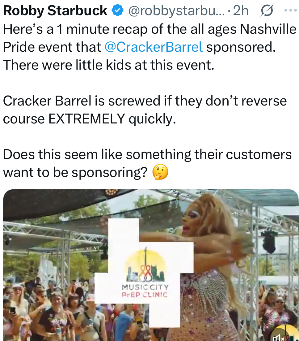 Spin for the win with morons is risky business but to each his own. I went to a CB back in the day at it was good grub. Then I went a few years ago and it was old and nasty. The place smells like old food and just old everything. It reminded me of my time trying to eat at Split Pea Soup on my way up North. Old days, that place was so good and the food was amazing. I went before it was closed for good and the place was shit. I walked out super discouraged. Its just like the old San Fran and the new San Fran. I spoke to a guy the other day that moved to Nevada from San Fran. He said the city is shit and needs NG ASAP. Satan did start his church there in 66', FYI.I'm a big fan of Cracker Barrel's chicken and dumplings. I will defend CB like I defended Denny's. Consistent quality, comfort food. I think this issue with CB is being overblown. I don't see it as an attempt to go woke, I see it more as an attempt to modernize. It's interiors are totally dated; however, that's part of its nostalgic charm and CB management grossly miscalculated that appeal. It will become an MBA case study like New Coke and Bud Light. CB could still potentially spin this into a win.