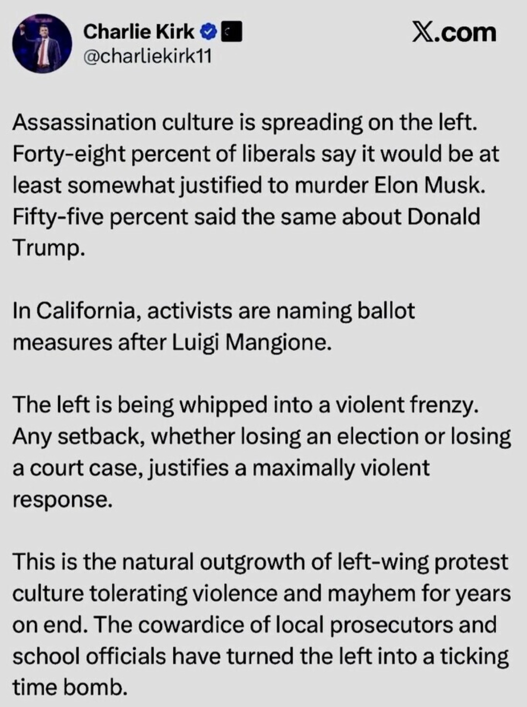 I did not watch Charlie Kirk much excpet for sound bites here and there. The young people like my son have been following and people like espola didn't like that from what I hear. His crowds were huge and getting bigger. His message of free speech and his love for his God and what he stood for got him killed today. These are the consequences from the left for his actions and his words. They & Them are sending a message to the young people. Wear a mask, take our jabs, STFU about what Charlie believes or else you can die as well. These fucks offered us free jabs and even bribed us with free French fries, free lap dance or free paid day off at work. One place paid $75 to come in for free poison. Again, if you said no to these nutjobs, you get taken out financially by being fired, lose business, lose house, lose credit score, lose everything. It trips me out how much they hated Charlie. I know they hate Trump and from what I hear, tried to take him out 8 times, 6 we don't know about but soon will.