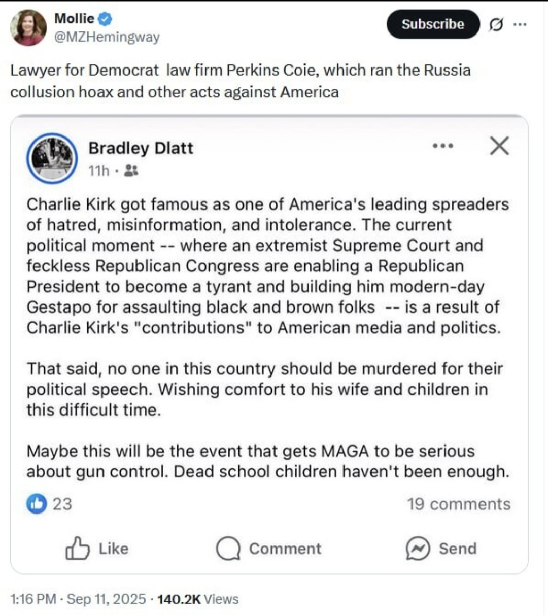 Nevermind, that her Facebook page is a treasure trove of people celebrating Kirk's death and rooting for the death of Trump.