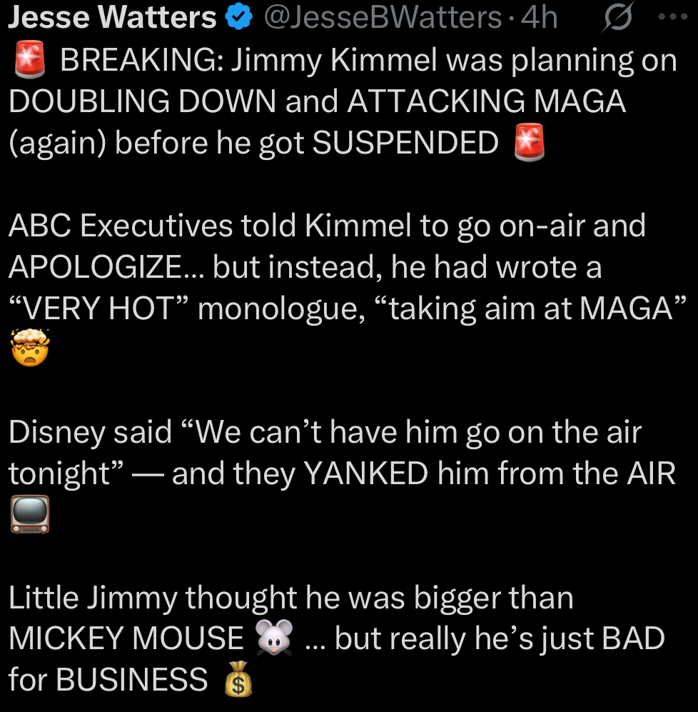 The locals from the affiliates told local stations (with local advertisers) they we will NEVER watch ABC ever again and that is why Jimmy was put down. "We love you Satan" didn't help either. Disney needs to clean their house of demons they have working for them, or they will go away. Jimmy promoted one side, his side, and got political every night for his side. FCC didn't like it. He was not a late-night talk show host. He was a fraud. He was for one side, The Dems and now we know what the Dems support, which is to assassinate your opponent's potential future President and #1 influencer for the youth, which is now wanting to follow Christ. The youth watched the assassination live on social media. That's not a laughing matter or something to celebrate openly and if your stoked he got whacked, shut the fuck up and keep it to yourself. However, were all actually very happy to see the darkness of people's hearts written out for all to see, like ABC. America is awake and like I said before, once you go woke, you will go broke. Woke is for losers.