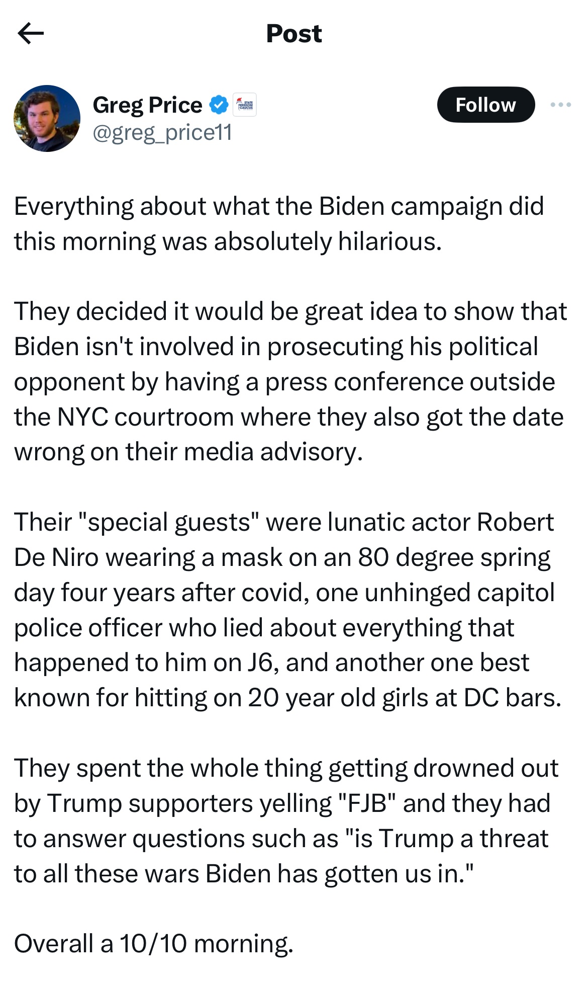 he has no trouble explaining Trump’s appeal: “A lot of people had this experience that they did better when Trump was in office, paired with Biden shitting himself and having dementia.”