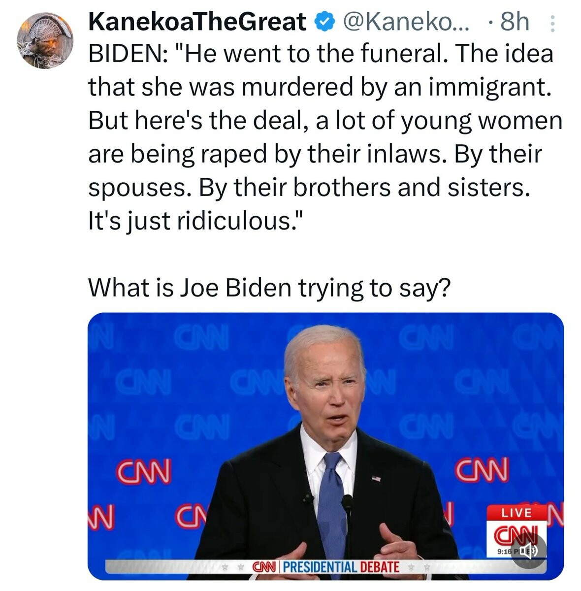 AB-SO-FUCKING-LUTELY.I'm not a conspiracy guy, but I find CNN's 180 on Biden suspicious. His performance tonight wasn't unprecedented for him. CNN has always dismissed or explained away Biden's cognitive issues and his frozen, far away stare. Either they've gotten a huge dose of truth serum, or they know he can't win and are greasing the skids for a new candidate.