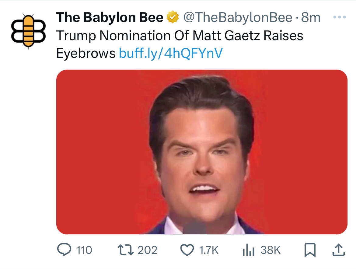Anyone can be confirmed, pardoned or attacked. This will be interesting. Entertaining to say the least.Ok, Matt Gaetz is a terrible pick for AG. So many better options.