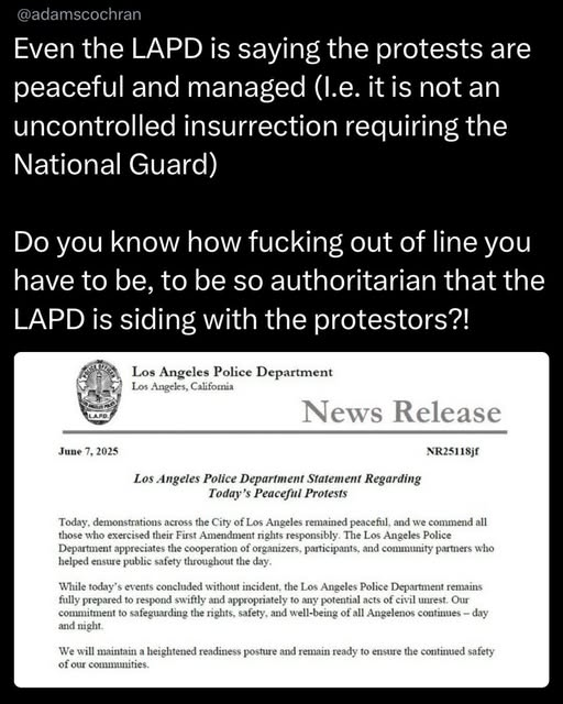 Everybody seems to be against this authoritarian regime, except the true face painters. All this time “conservatives” crying about censorship as if lies and cruelty deserve a platform. It’s no mystery where this is leading.My only interaction with an LA cop was with the father of one of my Navy roommates. He was a car theft detective and former fireman. He and his wife, and the daughter in college lived in a big house on a long lot (long way from street to alley) with a separate garage/workshop on the alley gate end.