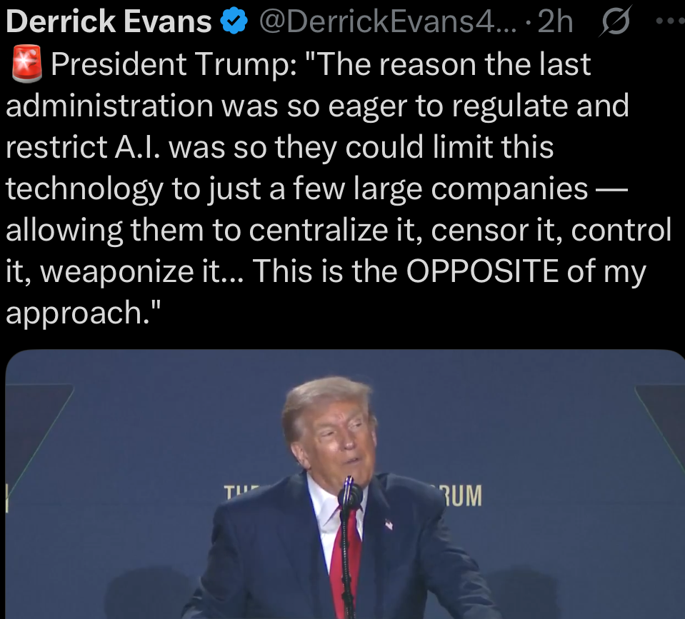 Sound familiar? Can you say Facebook? Twitter? The Internet? MSM? Free market and free fucking energy is on its way, yay!!!Fascism! How dare Trump open access to AI so the government can’t regulate, censor, and weaponize the use of AI.