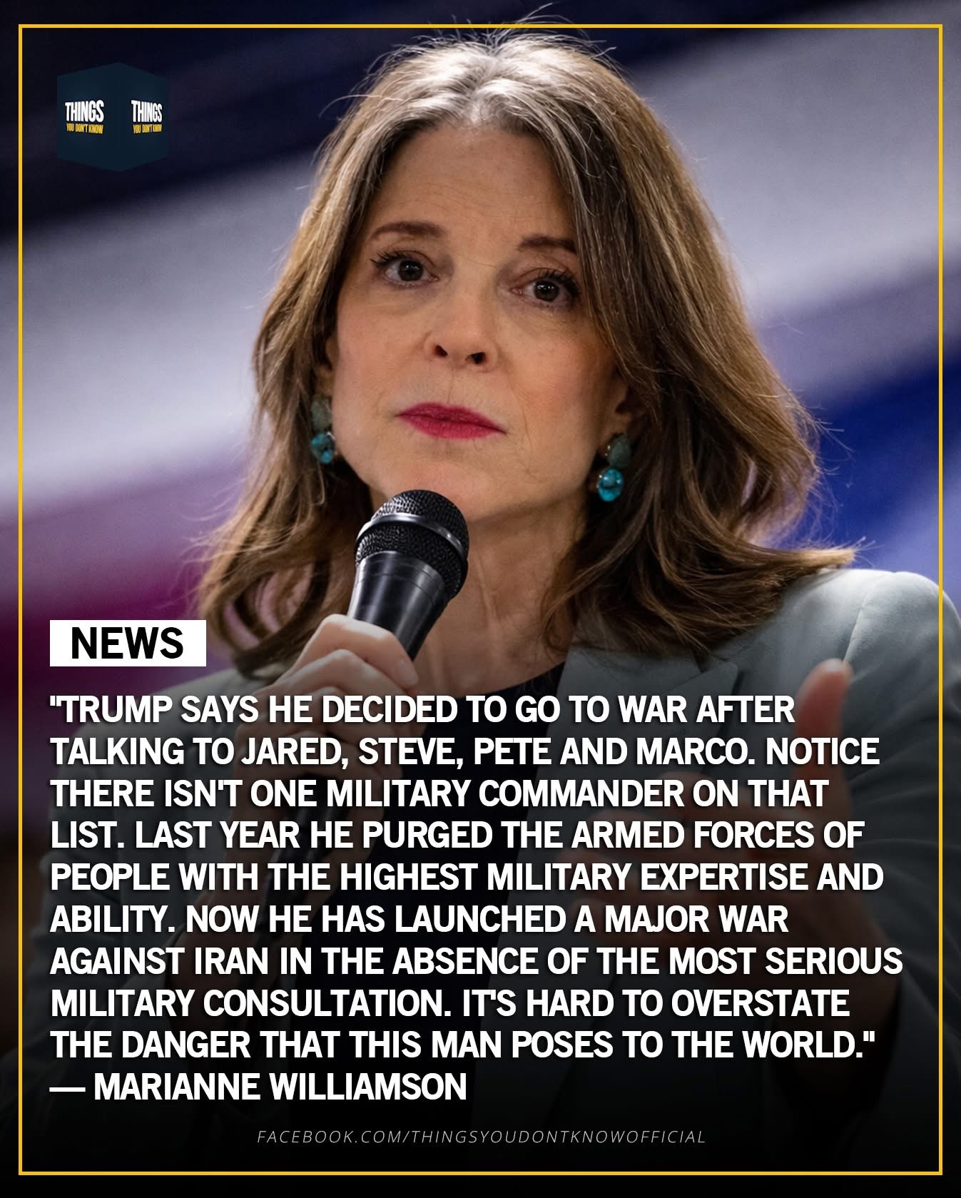 During a press conference on March 9, 2026, Donald Trump told reporters that his decision to launch Operation Epic Fury against Iran was shaped by conversations with Steve Witkoff, Jared Kushner, Pete Hegseth, and Marco Rubio. Not one active military commander was mentioned. Marianne Williamson highlighted this in a widely shared statement, pointing out that Trump had purged senior military leadership the year before and then launched a major war without traditional military consultation.