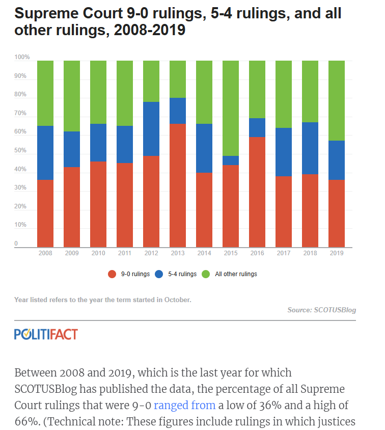 Fair point, but I didn't blame her for anything. Really just generally trying to point out (maybe inarticulately) that SCOTUS works great as designed and that originalists aren't a problem, or at least no more of an issue than the "liberalists" on the Court (for lack of a better term). You cherry picked a time period to say the court agreeing on decisions is a misconception. Factually the conservatives are more "agreeable" than the liberals on the court. With 3 conservatives (some that have been accused of "orginalism") voting 80% with the 3 liberals, more so than the other conservatives, I'd say that's effectively a bi-partisan court. Despite this fact the is Left is crying about the Right packing the court and threatening to expand it.
