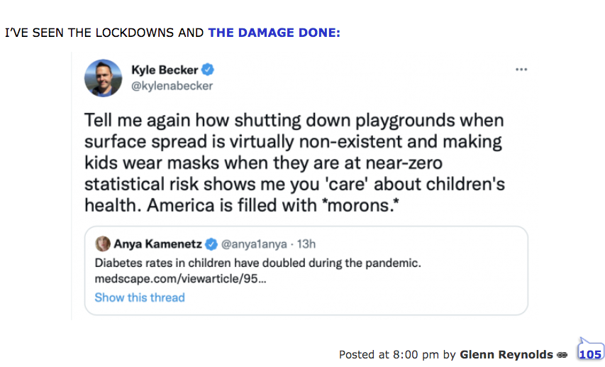 Calling them morons is letting them off the hook. The people making kids wear masks and shutting down their activities know exactly what they are doing. Everyone knows children have less than miniscule risk from Covid. When you point that out to the children punishers they may even admit that, but they say its to prevent "community spread". "Community Spread" is their euphemism for "I don't want to get Covid from a child". So instead of putting the responsibility on at-risk adults they put the responsibility on healthy children. It's part of our new upside down society.